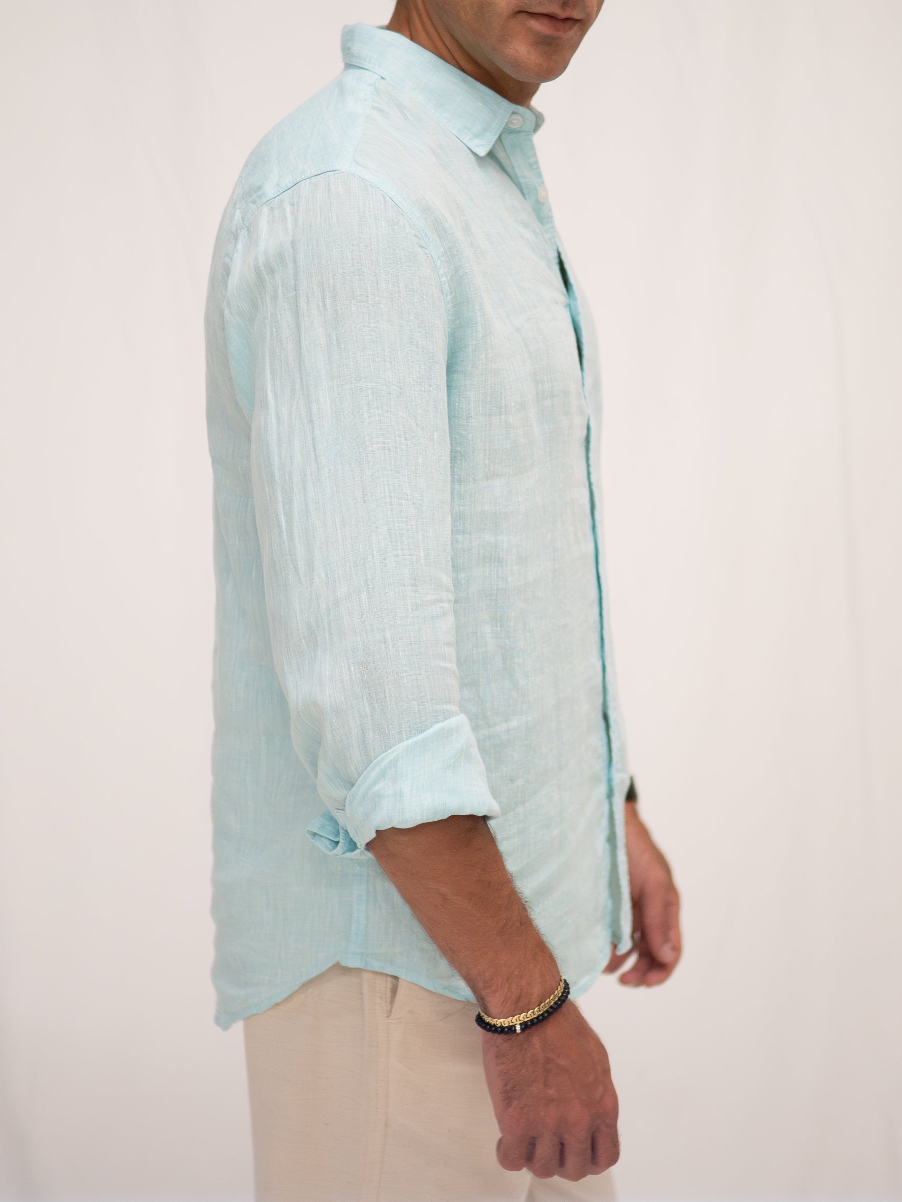 Camisa de manga larga; Color Verde Agua, 100% Lino; Cuello clásico y cierre frontal con botones, Corte recto; Tallas S- 3XL; Confeccionada en India; Lavar máximo a 30º y planchar a baja temperatura (máximo 110º).