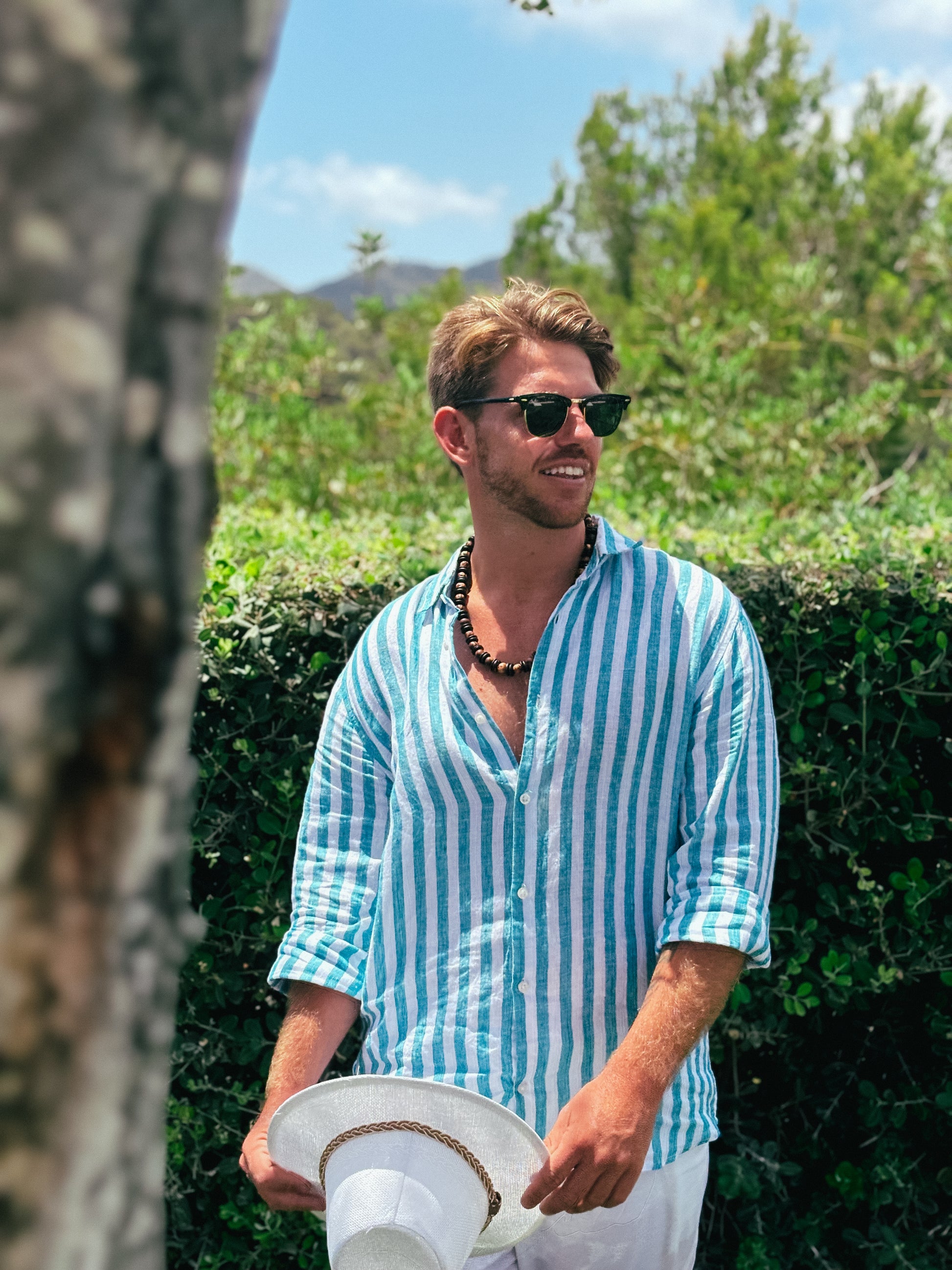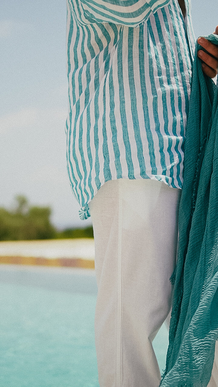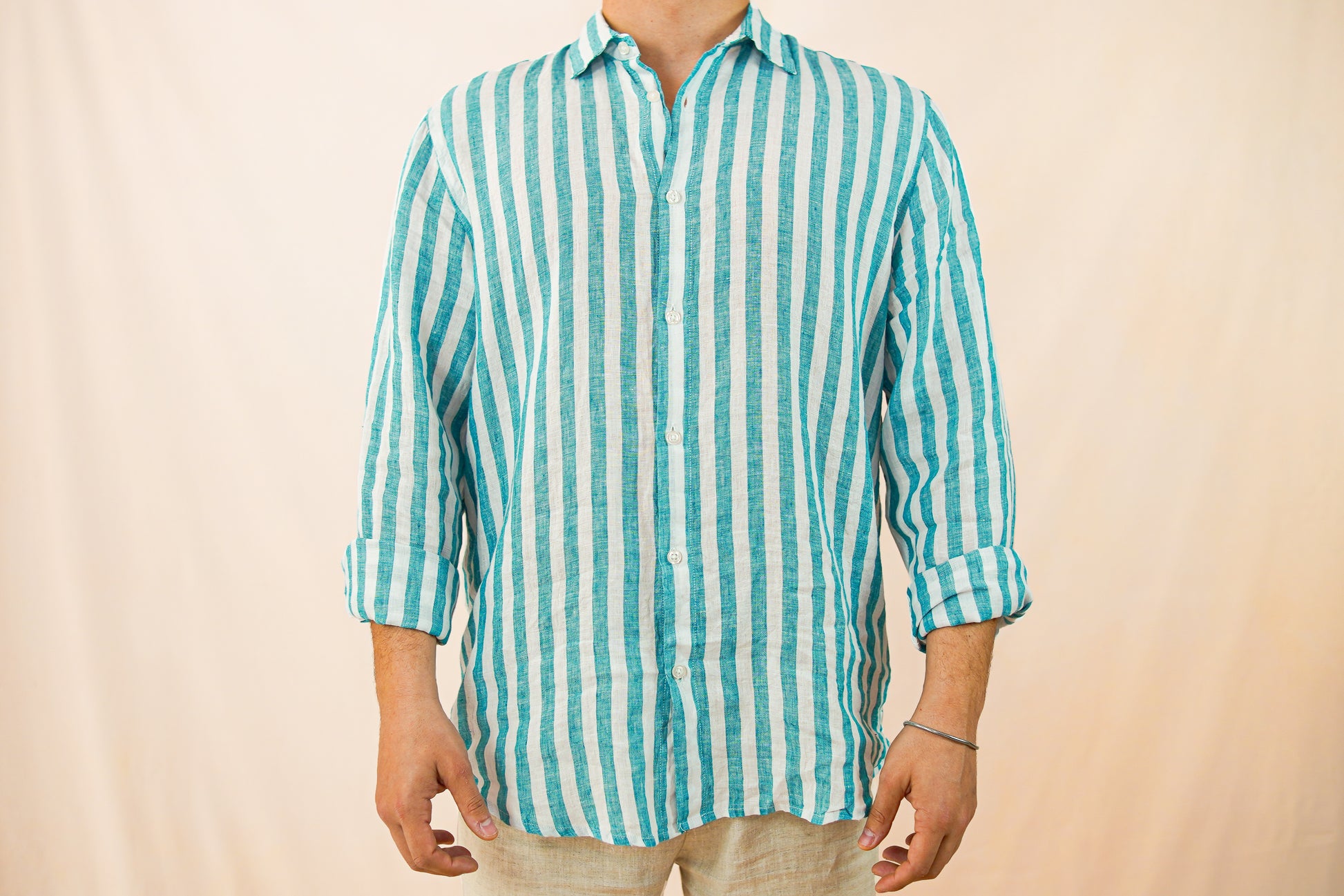 Camisa de lino, manga larga y cuello clásico con un diseño de rayas verticales verde turquesa y blanco.